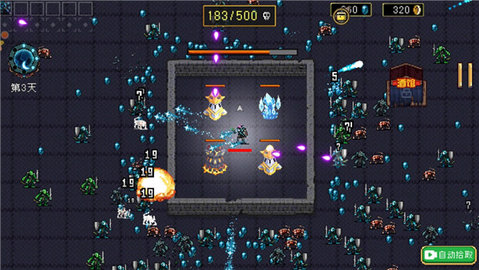 3、消灭怪物获得的经验值会显示在屏幕上方,经验条满后角色等级提升,立即从随机出现的三个新技能中选择一个学习。