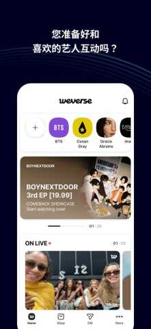 weverse黑色版是一款追星社区交流软件,汇集了全球众多知名艺人的官方动态与独家内容,粉丝能够直接获取偶像的最新资讯、独家影像与行程安排,软件构建了一个以艺人为核心的线上社区,实现了粉丝与偶像之间、粉丝与粉丝之间的紧密连接,各类线上应援、直播互动与专属活动,让追星体验更加沉浸和多元。