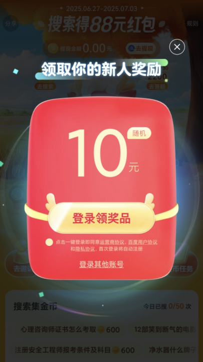 神龙红包百度是一款百度官方推出的现金红包活动工具,用户使用百度App搜索特定关键词即可进入活动页面,每日完成签到、搜索任务或邀请好友等操作能够积累奖励,这些奖励最终可以兑换为现金红包,活动设计提升用户参与搜索的积极性,为日常网络互动增添趣味性,最新版本优化了任务流程与提现机制,确保奖励获取与兑换过程更为顺畅。