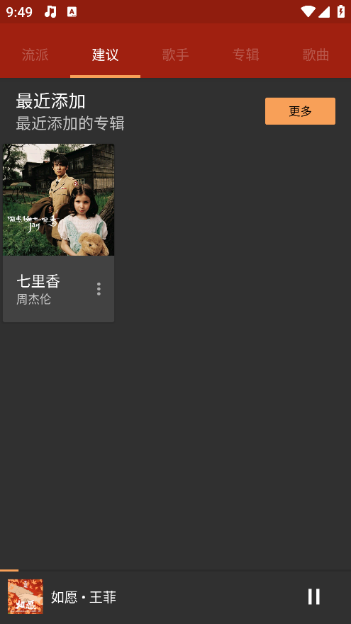 2、扫描完成后,主界面会显示歌曲、艺术家、专辑、播放列表等分类标签,点击即可进入相应视图浏览音乐。