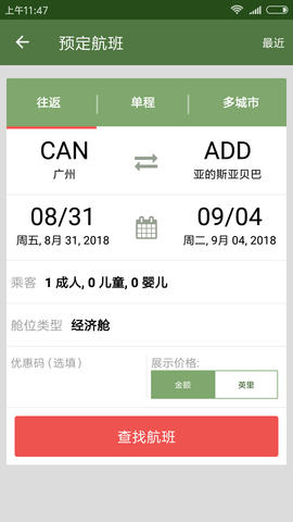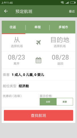 1、启动后进入行程搜索页面,选择行程类型为单程或往返,依次输入出发城市、到达城市以及期望的旅行日期。