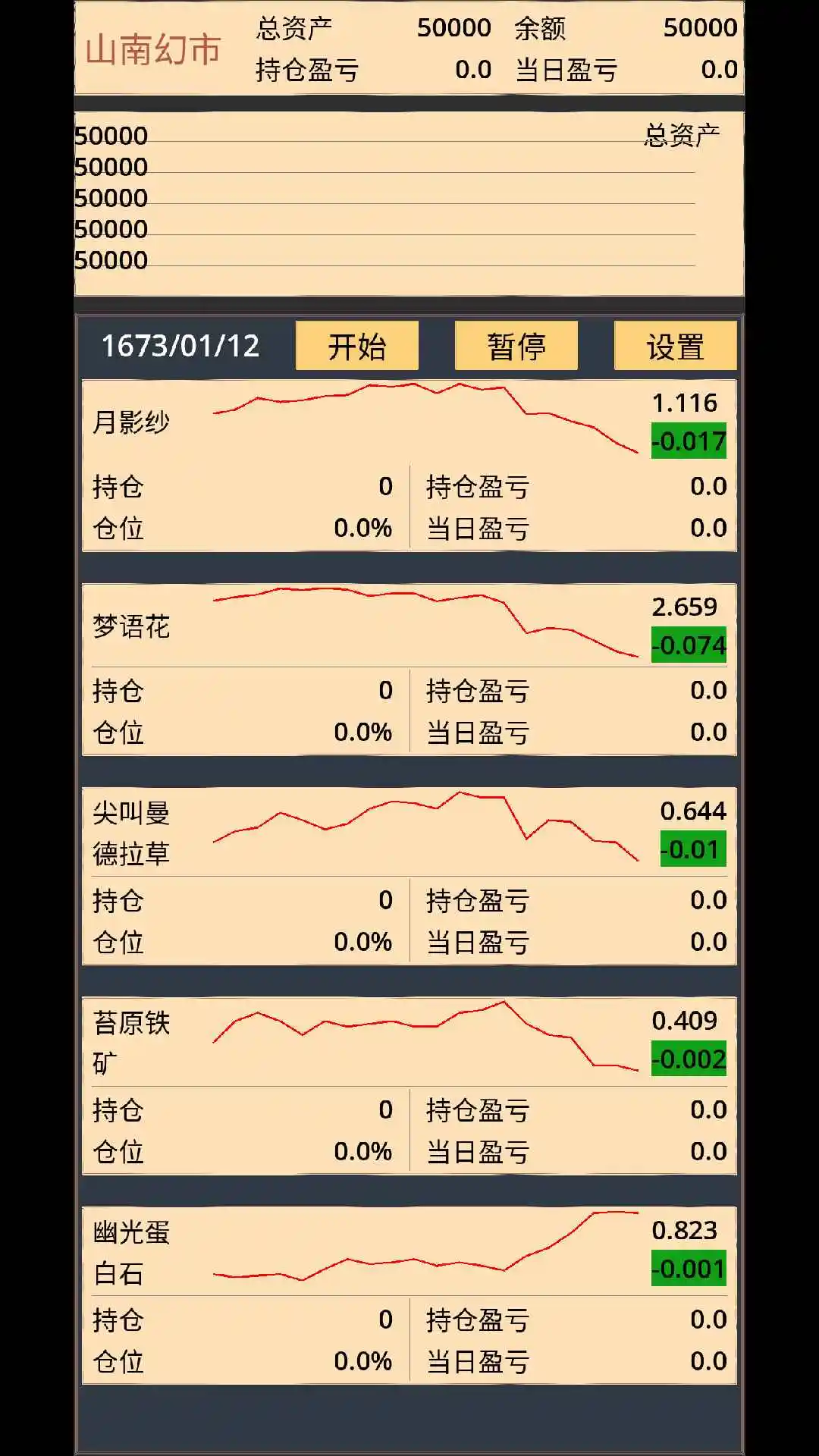 山南幻市是一款以古代市集为背景的经营模拟游戏,行商角色从一笔启动资金开始,在时间流逝中积累财富,市集环境充满机遇与风险,商品价格受多种因素影响,交易过程需要判断时机,财富积累的目标是成为传奇商人,游戏进程模拟真实商业逻辑。