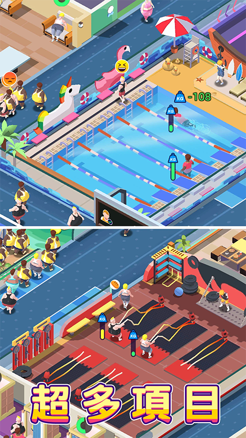 2、游戏内模拟了数十种常见的健身项目,每种项目都配有生动的动画表现,顾客在不同区域锻炼的场景构成了场馆内活力十足的景象。