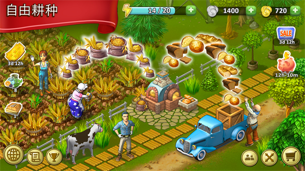 农场成长是一款以农场发展为背景的模拟经营类游戏,背景设定在上世纪三十年代的美国农业危机时期,游戏采用怀旧复古的美术风格,营造出独特的时代氛围,玩家需要从一片小小的田地开始经营,通过开垦土地、种植作物、饲养家禽牲畜来获取资源,收获的原材料可以进一步加工成商品,用于交换或完成任务,从而解锁更多种类的动植物与生产建筑,逐步扩大农场的规模与影响力。