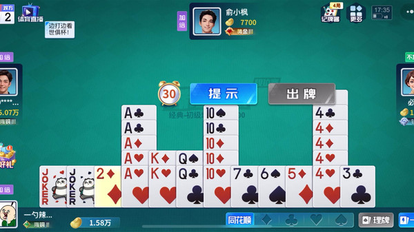 4、每一局以一方先出完手牌为结束,根据对方剩余手牌的数量(称为头游、二游等)来计算本局得分,并换算成等级积分。