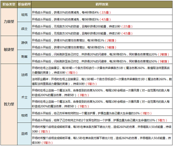 坦克:体魄强健,肉盾防御职业战士:冲锋在前,近战输出职业游侠:远程狙杀,单体输出职业刺客:走位飘忽,偷袭强攻职业法师:风雷火电,法系爆发职业术士:次元掌握,核心控场职业牧师:续航中坚,治疗辅助职业巫师:神奇诡秘,全能法系职业当相同职业类型的英雄在同一个队伍中共同作战时,他们会惺惺相惜,也会因为相同或相似的职业而拥有一些战斗上的默契,这种对我们作战极为有利的默契就被叫做职业羁绊。职业羁绊会带来极大的战斗加成。