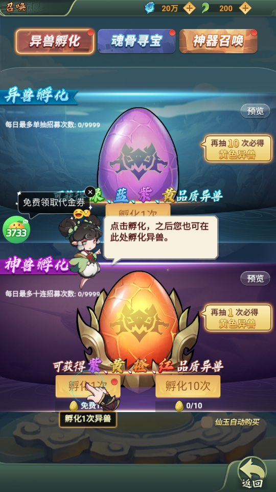 4、点击孵化即可在此处孵化异兽,一般可获得绿、蓝、紫、黄、橙、红等品质的异兽;
