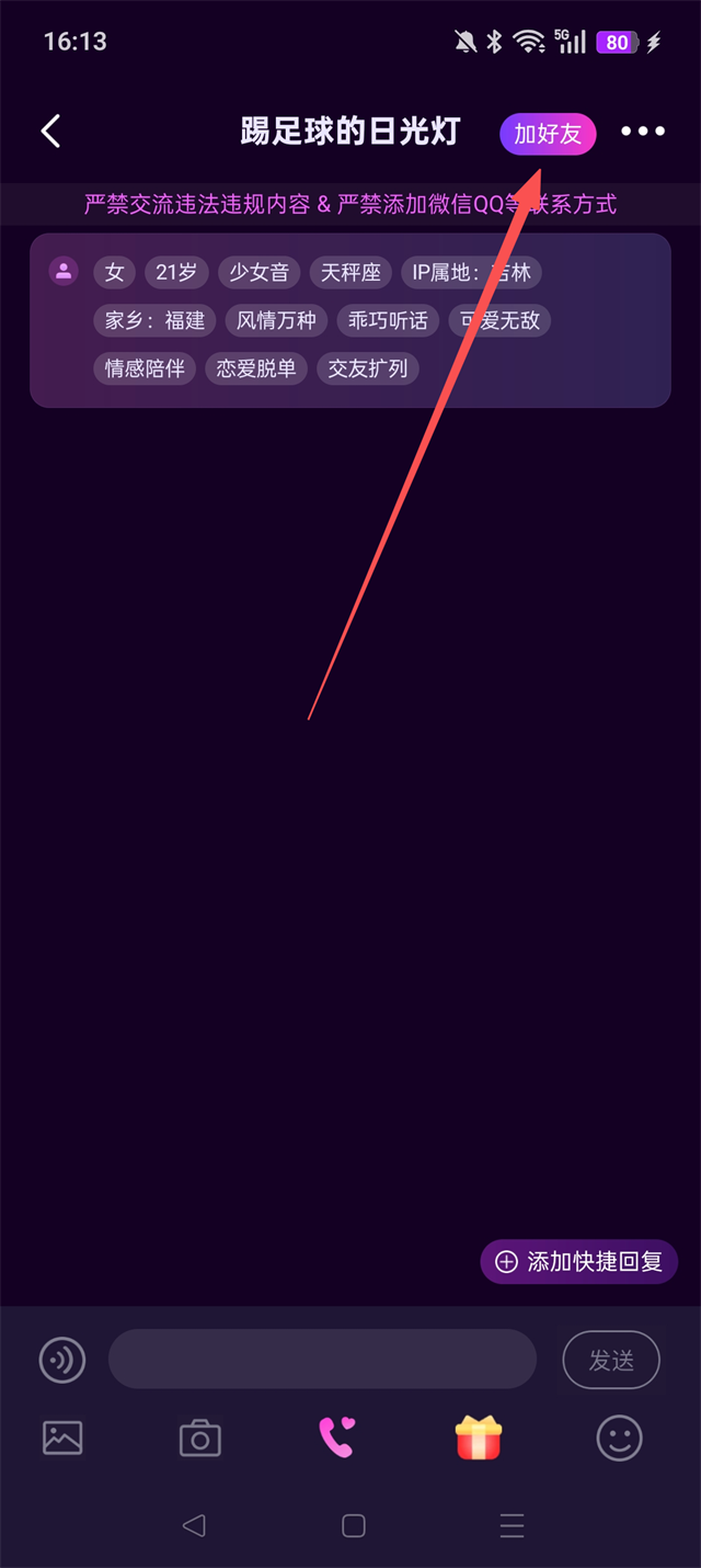 5、当你遇到聊得来的人,想要加为好友,方法很简单。在聊天界面或对方个人主页,会有一个明显的加好友按钮,点击并发送申请,对方同意后,你们就会出现在彼此的好友列表里,以后约房间或玩游戏就更方便了。