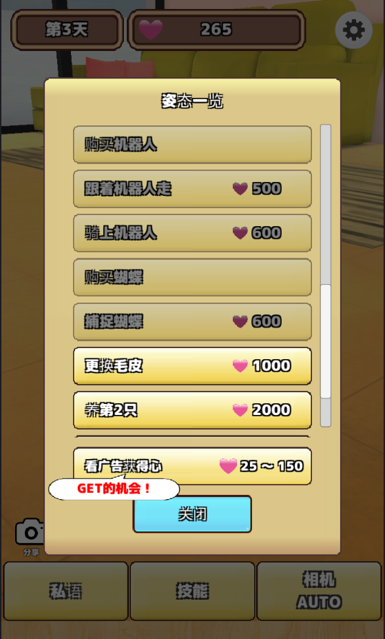 3、亲密度是解锁新互动和装扮的关键。多使用玩具栏里的逗猫棒、激光笔陪它玩耍,每次成功的互动都会让心形标志亮起。当亲密度达到一定等级,你就可以为它解锁新的发型或服装了。