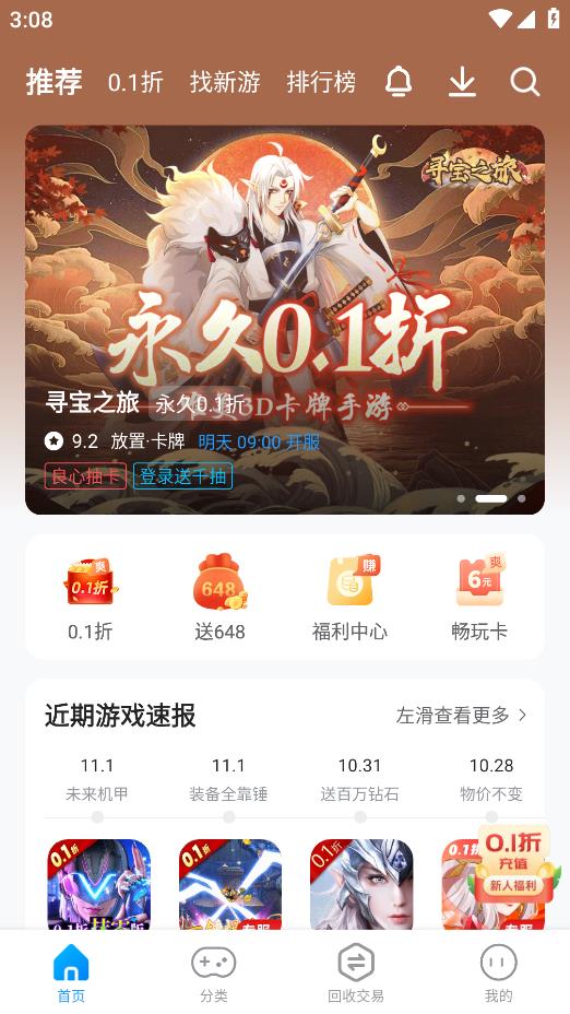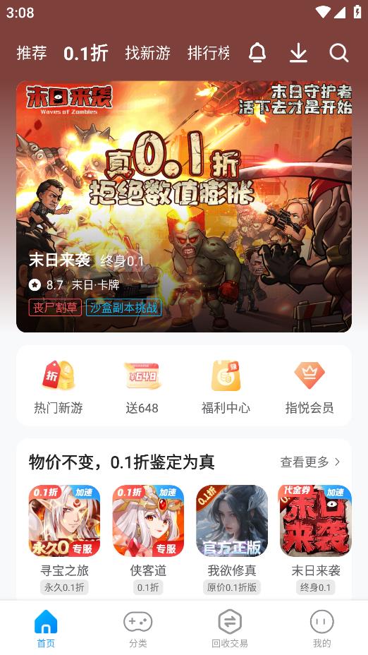 指趣手游app是一款集合了海量折扣手游资源的软件,带来了市面上热门的角色扮演、策略对战、休闲益智等多种类型游戏,尤其以0.1折的超低折扣专区和新游首发专区为核心吸引力。软件不仅将玩家感兴趣的游戏福利打包呈现,更引入了便捷的账号回收与交易服务,让游戏体验从下载到后期互动都充满惊喜,为手游爱好者打造了一个省心又实惠的一站式游戏乐园。